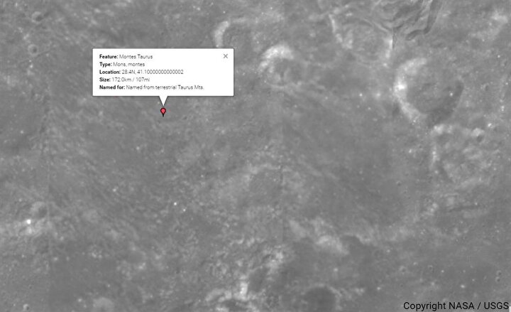 4) TOROS SIRADAĞLARI: Toroslar, orijinal adıyla Taurus Dağları olarak Ay’ın kuzey yarımküresinde yer alıyor. 1647 yılında Hevelius haritasında gösterilen dağların konumu, Mare Serenitatis (Huzur Denizi) ile Mare Crisium (Buhran Denizi) arasında. En yüksek tepeleri doğuda 3.000 metre yükseklikte, batıda ise 900 metreye kadar azalıyor.