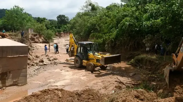 Des engins de chantier travaillent sur le site où un pont s'est effondré après que la rivière Pirai a débordé en raison de fortes pluies à El Torno, dans le département de Santa Cruz, en Bolivie, le 14 décembre 2025.