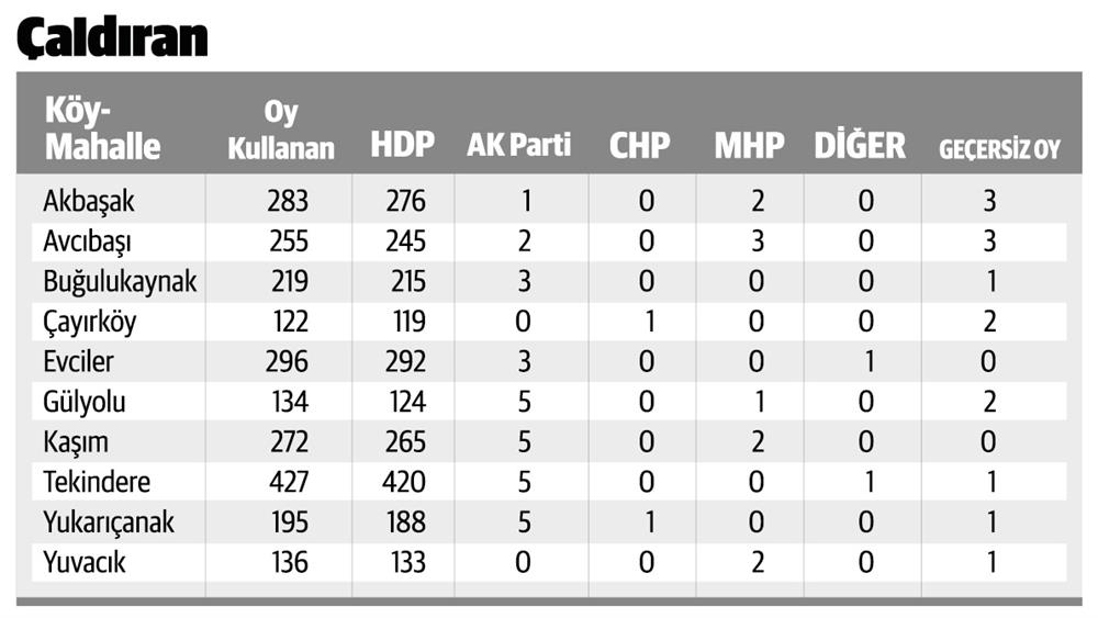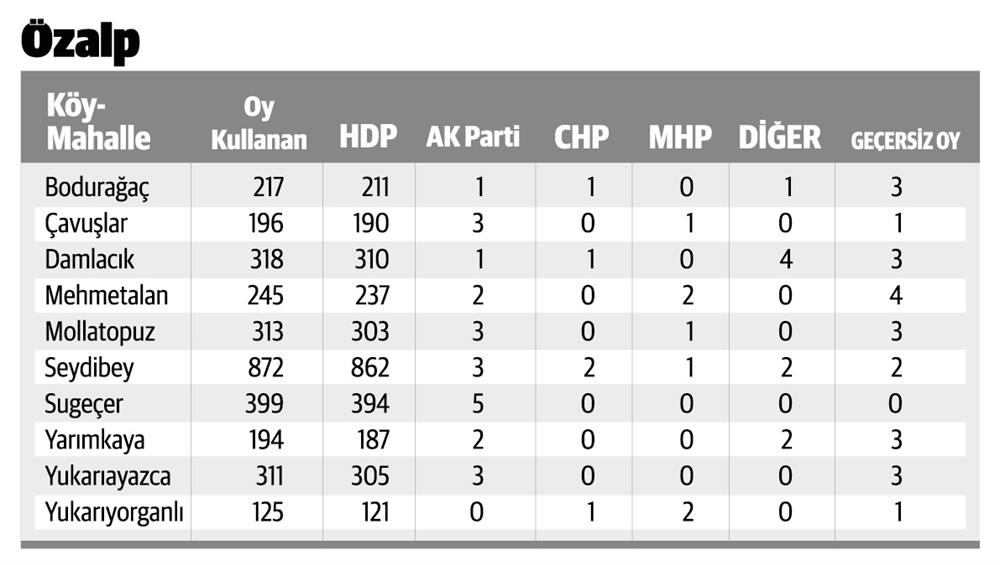 Özalp'ta 30 bin 374 seçmen oy kullandı. HDP'ye 27 bin 742 oy çıkarken, AK Parti'ye bin 386, CHP'ye 165, MHP'ye ise 324 oy çıktı. Çavuşlar köyünde 196 seçmenin 190'ı, Damlacık köyünde 318 seçmenin 310'u, Mollatopuz'da 313 seçmenin 303'ü HDP'ye oy verdi. Çaldıran'da 26 bin 588 seçmen oy kullandı. Oyların 496'sı geçersiz sayıldı. Çaldıran'da HDP'ye 22 bin 795 oy çıkarken, AK Parti'ye 2 bin 404, CHP'ye 156, MHP'ye ise 379 oy çıktı.