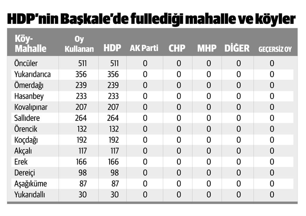 Sandıklardan ise, ilginç detaylar ortaya çıktı. Başkale ilçesindeki birçok köy ve mahallede diğer partilere hiç oy çıkmadı. Çoğu sandıkta ise yine geçersiz oy yok denecek kadar az kaldı. Fakat HDP'nin oy oranı, neredeyse seçmenin tamamına yakın çıktı. Başkale'de 26 bin 819 seçmen sandık başına giderek oy kullandı. 26 bin seçmenden sadece 184 kişinin oyu geçersiz sayıldı. Başkale'de HDP'ye toplam 25 bin 937 oy çıkarken, AK Parti'ye 317, MHP'ye 171, CHP'ye ise 100 oy çıktı.