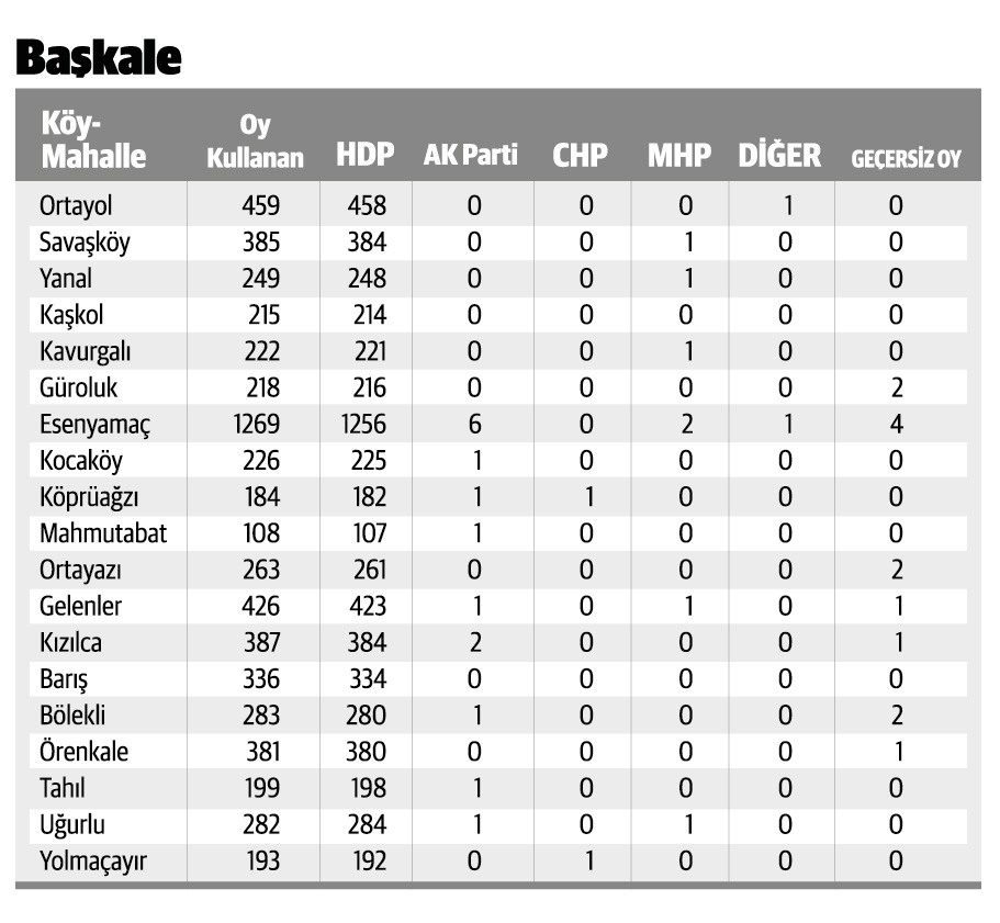 Başkale'de birçok köyde ise seçmenin bütün oyları HDP'ye çıktı. 13 köyde, HDP bütün oyları aldı. Diğer partiler oy alamazken, geçersiz hiçbir oy da çıkmadı.