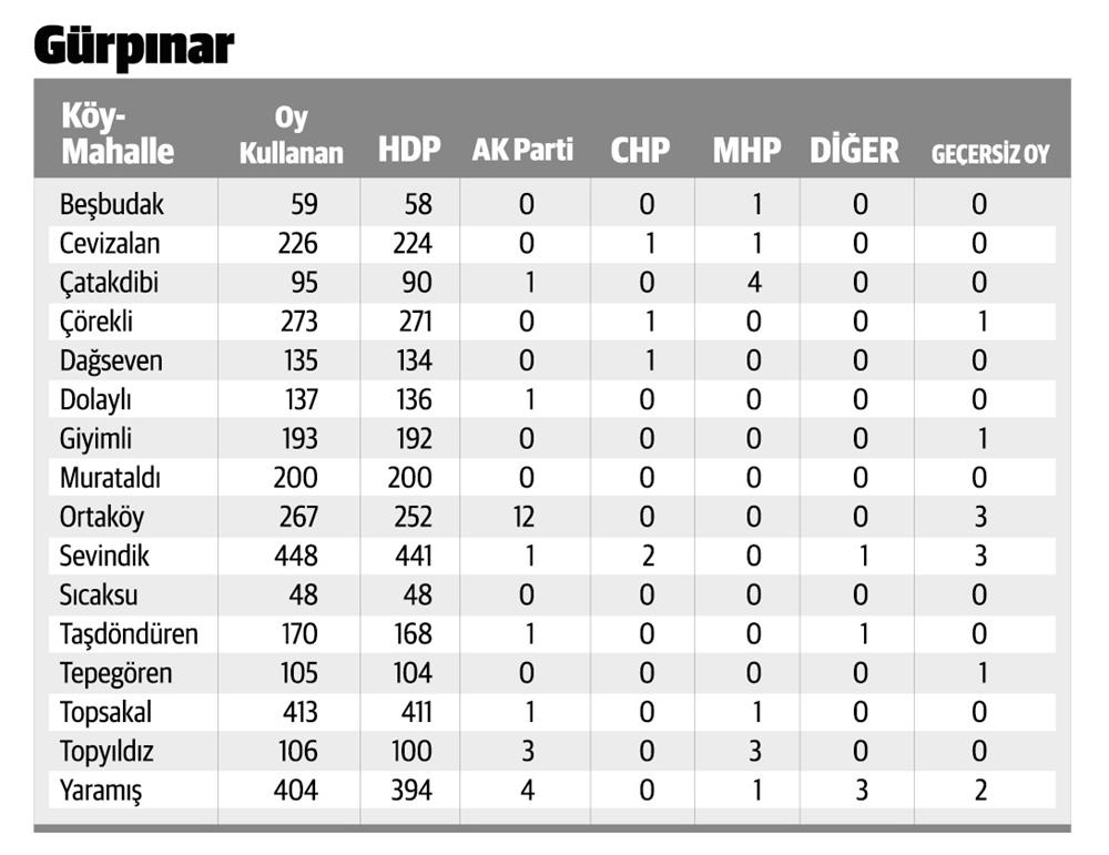 Van'ın Gürpınar ilçesinde de benzer tablolar söz konusu. Sandık başına giden 18 bin 581 seçmen ile Gürpınar'da seçimlere katılım yüzde 91 oldu. Bazı köylerde, oy kullanan seçmenin tüm oyları HDP'ye çıkarken, çoğu köyde de yine HDP birinci çıktı. Dağseven köyündeki 135 seçmenin 134'ü, Topsakal köyünde oy kullanan 413 seçmenin 411'i, Giyimli köyündeki 193 seçmenin 192'si HDP'ye oy verirken, Sıcaksu, Murataldı köylerinde bütün oylar HDP'ye çıktı.