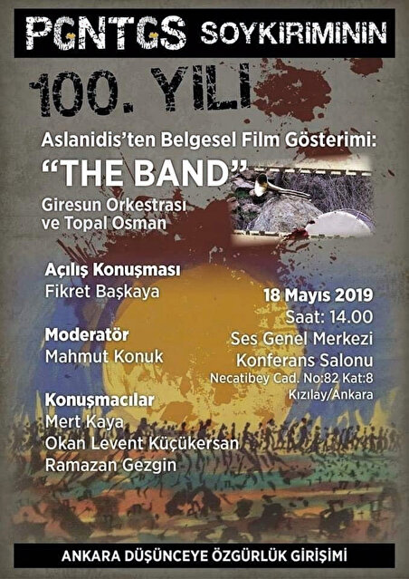 Pontus Rum tahrikli toplantıda, Yunanistan yapımlarından ‘The Band’ (Bando) adlı belgesel de izletilecekti. Türkiye’yi karalayan ‘Gece Yarısı Ekpresi’ filmini aratmayan, yönetmenliğini Nikos Aslanidis’in üstlendiği film, Mustafa Kemal’in muhafız birliği komutanı Giresunlu Topal Osman ile 42. ve 47. Gönüllü Alaylarını Karadeniz’de Rumları katletmiş gibi anlatıyor. Sözde soykırım iddiaları ile Kurtuluş Mücadelesi’ni gölgelemeye çalışan Pontusçuların utanç girişimi Ankara Valiliği tarafından engellendi. Valilik, demokratik kitle örgütlerinden gelen şikayetler ve tepkiler üzerine etkinliği yasaklandı. Böylece bu çevrelerin oyunu boşa çıkarıldı.