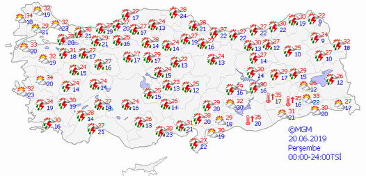 Meteoroloji Genel Müdürlüğü tarafından yapılan son hava durumu değerlendirmelere göre, Marmara’nın doğusu, İç Ege, Akdeniz, İç Anadolu, Karadeniz, Doğu Anadolu’nun kuzeyi ve batısı ile Aydın, Muğla, Bingöl, Muş, Van ve Hakkari çevrelerinin aralıklı sağanak ve gök gürültülü sağanak yağışlı geçeceği tahmin ediliyor. Yağışların; Akdeniz’in iç kesimleri, İç Anadolu, Karadeniz’in iç kesimleri, Bilecik, Sakarya, Kütahya, Afyonkarahisar, Samsun ve Rize çevreleri ile Ordu'nun güney ve batı kesimlerinin yerel olarak kuvvetli olması bekleniyor.