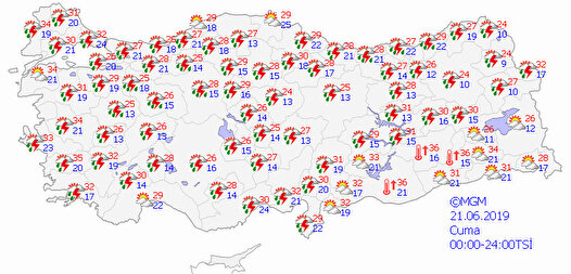 Meteorolojinin son hava durumu tahminlerine göre, Marmara'nın doğusu, İç Ege, Akdeniz, İç Anadolu, Karadeniz, Doğu Anadolu'nun kuzeyi ve batısı ile Aydın, Muğla, Bingöl, Muş, Van ve Hakkari çevrelerinin aralıklı sağanak ve gök gürültülü sağanak yağışlı geçeceği tahmin ediliyor. Yağışların, Akdeniz'in iç kesimleri, İç Anadolu, Karadeniz’in iç kesimleri, Bilecik, Sakarya, Kütahya, Afyonkarahisar, Samsun ve Rize çevreleri ile Ordu'nun güney ve batı kesimlerinin yerel olarak kuvvetli olması bekleniyor.