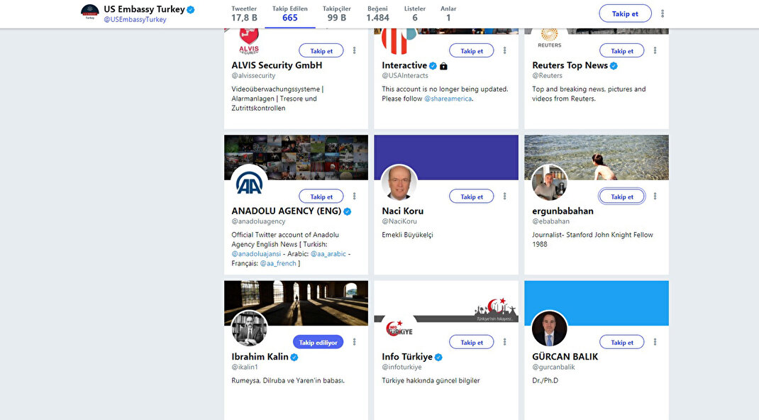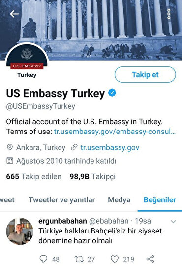 ABD'nin Türkiye Büyükelçiliği, resmi Twitter hesabından firari FETÖ tetikçisi Ergün Babahan'ın, MHP Genel Başkanı Devlet Bahçeli'yi hedef alan paylaşımını beğendi. Tepkiler nedeniyle açıklama yapmak zorunda kalan Büyükelçilik, "Bugün erken saatlerde Twitter hesabımızdan alakasız bir gönderi beğenilmiştir. Hatadan dolayı üzgünüz ve karışıklıktan dolayı da özür dileriz" ifadeleriyle açıklama yayınladı. Fakat FETÖ'cü Babahan'ın hesabı hala takipten çıkarılmış değil.