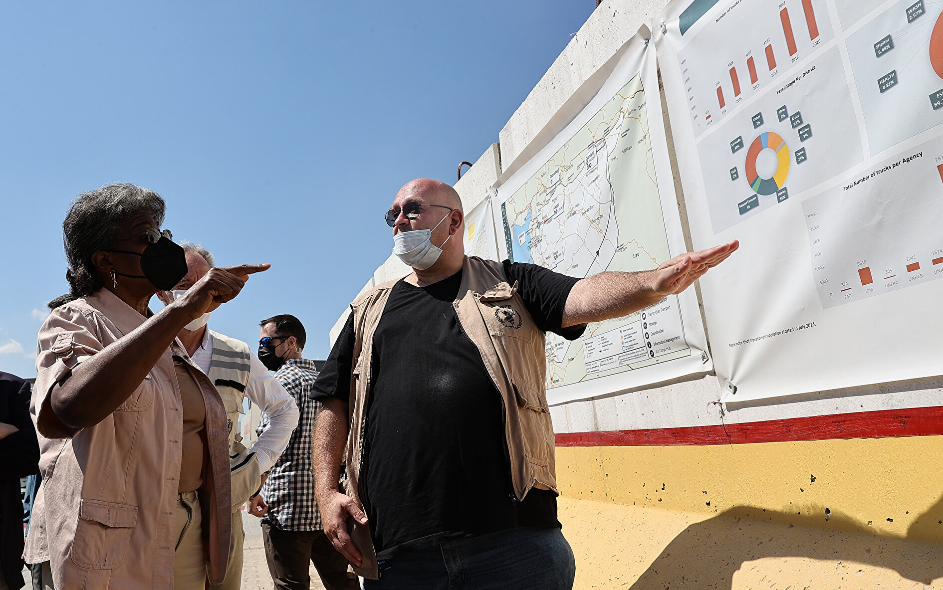 ABD'nin Birleşmiş Milletler (BM) Daimi Temsilcisi Linda Thomas-Greenfield Türkiye ziyareti kapsamında geldiği Hatay'ın Reyhanlı ilçesindeki WFP dağıtım merkezinde BM Suriye Krizi için Bölgesel İnsani Yardımlar Koordinatör Yardımcısı Mark Cutts ve insani yardım kurumlarının çalışanlarıyla bir araya gelerek çalışmalar hakkında bilgi aldı.