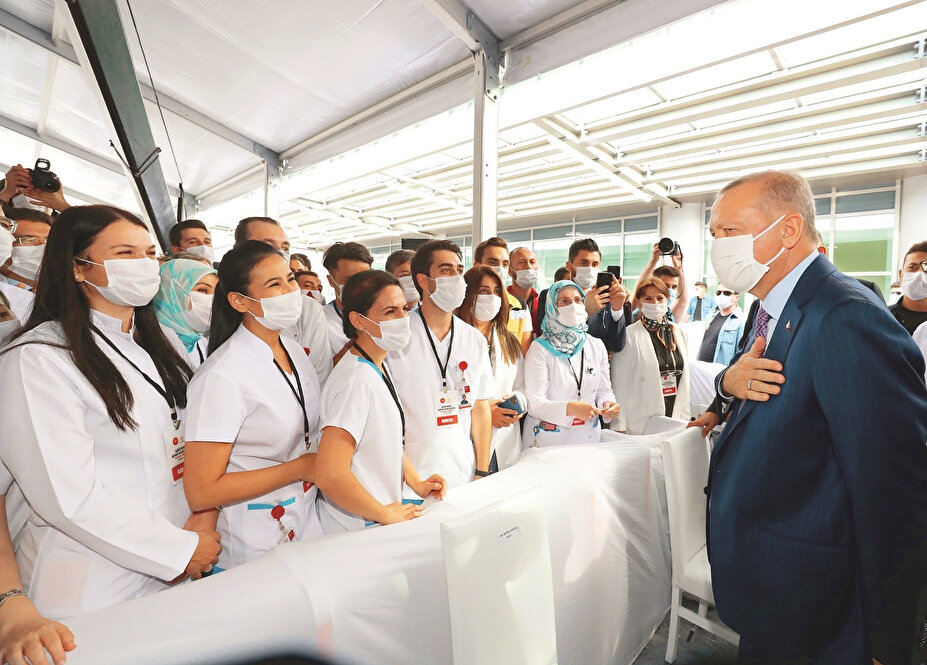 Erdoğan, “Milletimizin destekleriyle bu hastanelerimizi inşa ettik ve bundan sonra da tabii bütün inşa edilen hastanelerimiz milletimizin hizmetindedir. Halkımızın bir sağlıklı nefes almasına her şey feda. Olay bu kadar basit” dedi. Daha sonra Erdoğan, canlı olarak hastanenin çocuk cerrahisi kliniğine bağlandı ve yetkililerden hastane hakkında bilgi aldı, tedavi gören çocuklarla konuştu, geçmiş olsun dileklerini iletti. Açılışın ardından hastanede görev yapan sağlık personeli ile günün anısına hatıra fotoğrafı çektiren Erdoğan, programın devamında hastanenin bölümlerini ziyaret ederek incelemelerde bulundu.