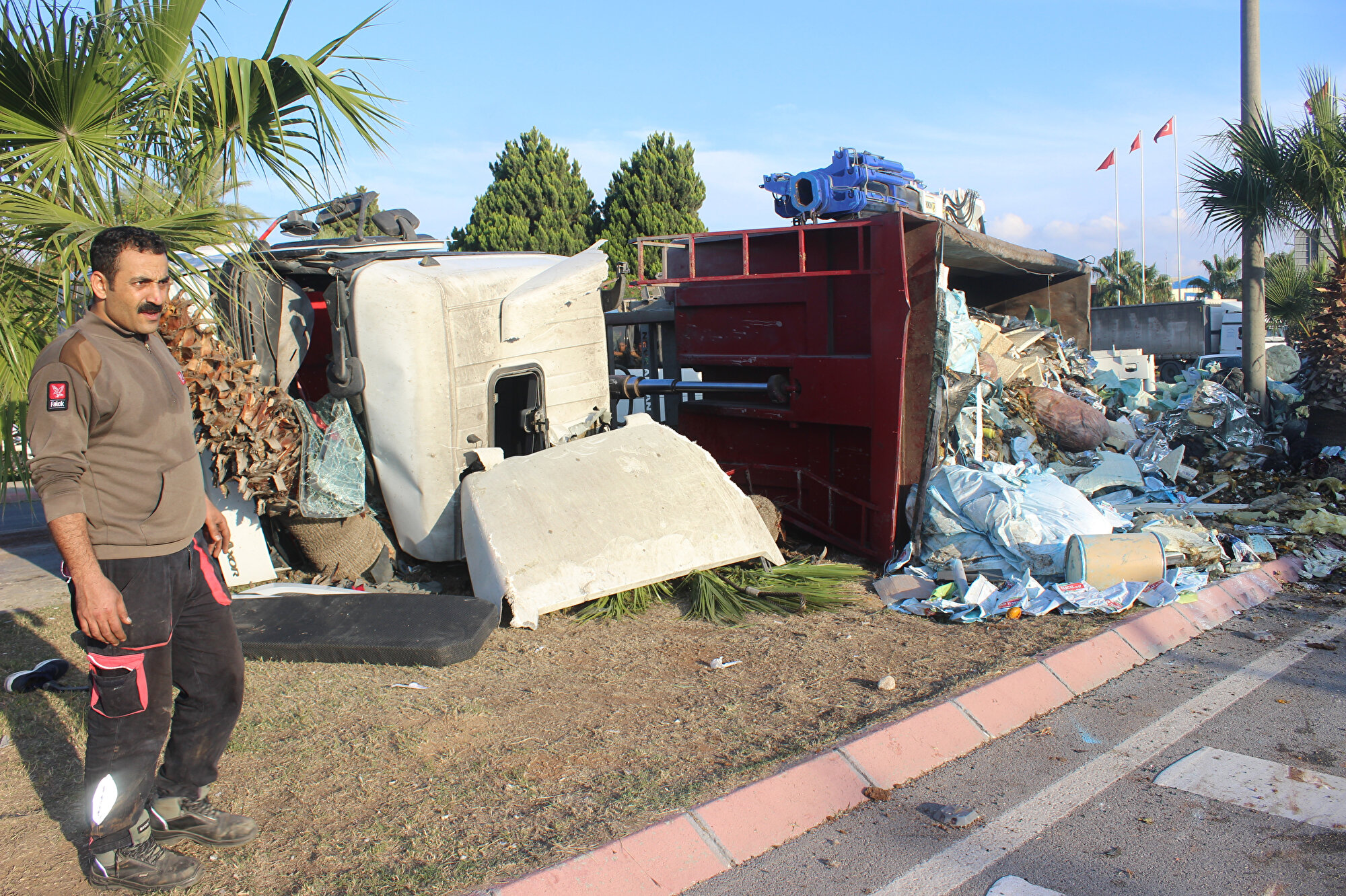 Adana'da Özkan Bayram'ın kullandığı 34 GJ 9787 plakalı çöp yüklü tır, Organizeye Sanayi Bölgesi girişinde devrildi. Devrilen tır bir süre sürüklendi, refüjdeki palmiye ağacına çarparak durabildi. Kazada sürücü ve yanındaki kişi yaralandı. Yaralılar hastaneye kaldırılırken, kaza nedeniyle çevreye saçılan çöpler iş makineleriyle toplandı.