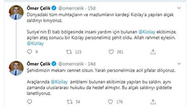 AK Partili Çelik, Twitter hesabından yaptığı açıklamada, Suriye'nin El Bab bölgesinde insani yardım için bulunan Kızılay ekibine açılan ateş sonucu 1 Kızılay personelinin şehit olduğunu hatırlatarak rahmet diledi.