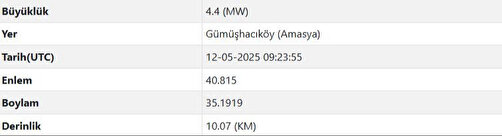 AFAD tarafından yapılan açıklamaya göre Amasya Gümüşhacıköy'de peş peşe iki deprem meydana geldi. 12.23'te gerçekleşen 4.4 büyüklüğündeki ilk depremin derinliği 10.07 km olarak ölçüldü. 12:26'daki ikinci depremin büyüklüğü ise 4.2 olarak açıklanırken derinliği de 19.0 km olarak kaydedildi.