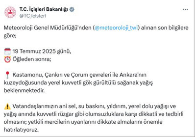 Bakanlığın sosyal medya hesabından yapılan açıklamada, Meteoroloji Genel Müdürlüğü'nden alınan son bilgilere göre; bugün öğleden sonra, Kastamonu, Çankırı ve Çorum çevreleri ile Ankara'nın kuzeydoğusunda yerel kuvvetli gök gürültülü sağanak yağış beklendiği belirtildi. Açıklamada, vatandaşların ani sel, su baskını, yıldırım, yerel dolu yağışı ve yağış anında kuvvetli rüzgar gibi olumsuzluklara karşı dikkatli ve tedbirli olmaları, yetkili mercilerin uyarılarını dikkate almalarını uyarısında bulunuldu.