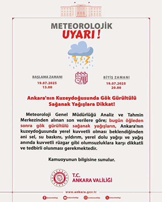 Ankara Valiliği'nden yapılan açıklamada, "Bugün öğleden sonra gök gürültülü sağanak yağışların, Ankara'nın kuzeydoğusunda yerel kuvvetli olması beklendiğinden ani sel, su baskını, yıldırım, yerel dolu yağışı ve yağış anında kuvvetli rüzgar gibi olumsuzluklara karşı dikkatli ve tedbirli olunması gerekmektedir" ifadeleri kullanıldı.