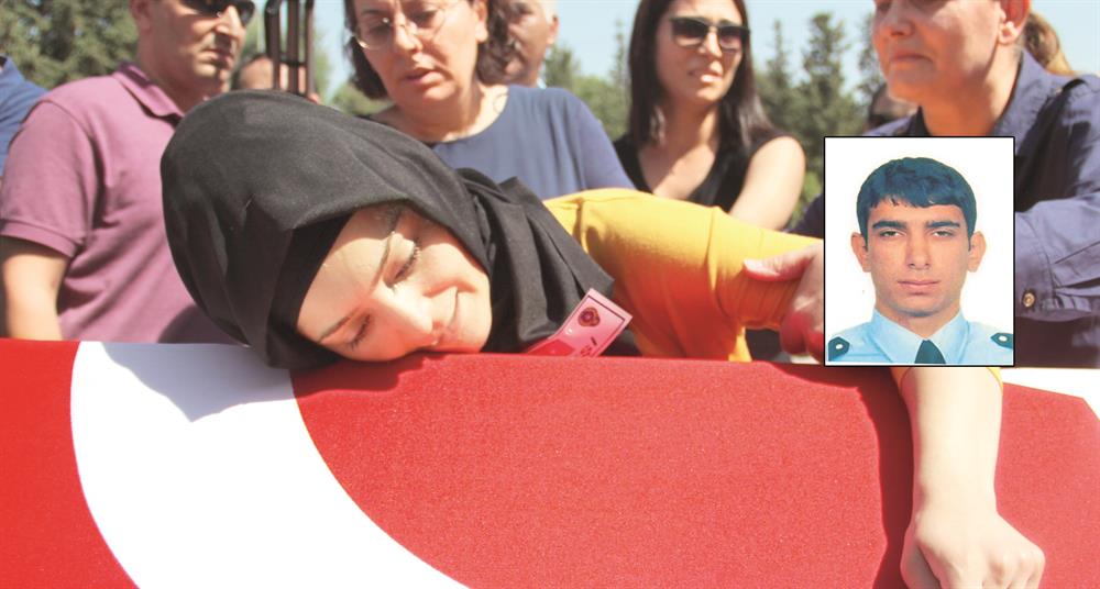 Camii'ndeki cenaze töreninde ise eşinin tabutunu okşadıktan sonra kameralara dönen acılı eş, “Benim şehidimi kalleşçe