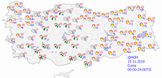 Meteorolojinin son hava durumu değerlendirmelerine göre, Batı ve Orta Akdeniz, İç Anadolu'nun güney ve batısı, Afyonkarahisar, Denizli, Adana, Mersin, Hatay, Bolu ve Karabük çevrelerinin sağanak ve yer yer gök gürültülü sağanak yağışlı, diğer yerlerin az bulutlu ve açık geçeceği tahmin ediliyor. Yağışların Antalya ve Mersin çevrelerinde kuvvetli olması bekleniyor.