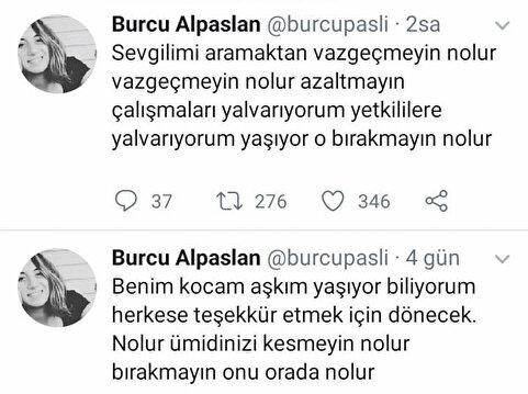 Uludağ’da 12 gün önce kaybolan 2 dağcıyı arama çalışmaları halen sürerken kayıp dağcılardan Mert Alpaslan’ın eşinin yaptığı paylaşım yürekleri dağladı. Burcu Alpaslan, “Sevgilimi aramaktan vazgeçmeyin ne olur. Ne olur azaltmayın çalışmaları. Yetkililere yalvarıyorum, yaşıyor o, bırakmayın ne olur” dedi.