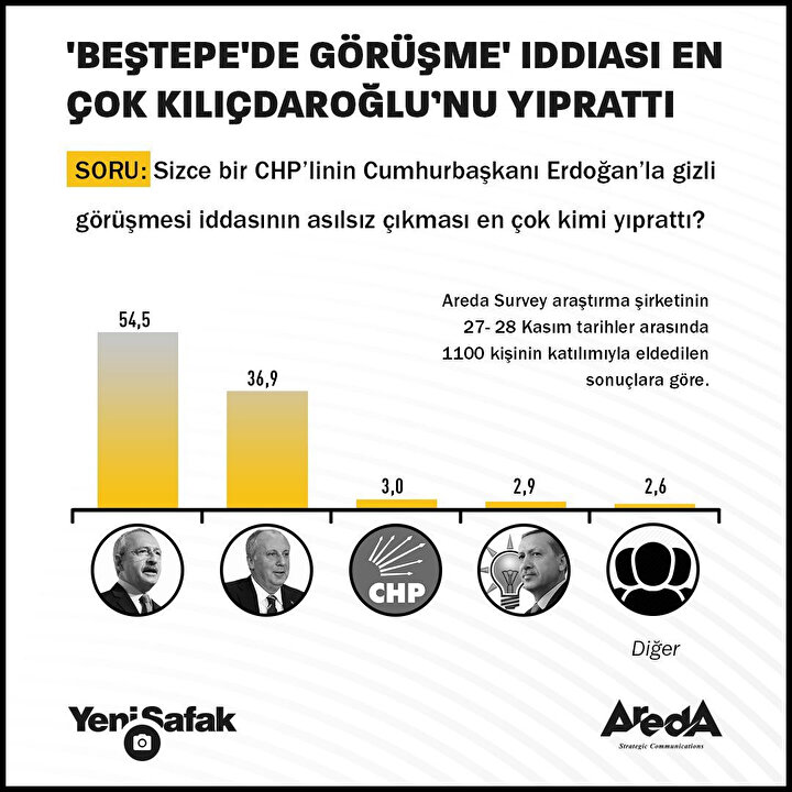 Araştırma şirketi Areda Survey, gündemi ele alan bir araştırma gerçekleştirdi. 27-28 Kasım tarihlerini kapsayan araştırmada 'Beştepe'de görüşme' iddiasının en çok kimi yıprattığı konusunda düşünceleri sorulan katılımcıların yüzde 54,5’inin CHP Genel Başkanı Kemal Kılıçdaroğlu cevabı verildiği araştırma şirketi tarafından duyuruldu.