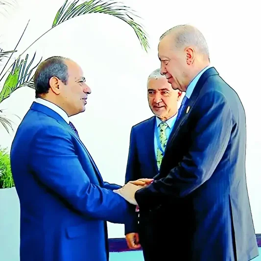 Zirvenin düzenleneceği salona gelişinde Mısır Cumhurbaşkanı Abdulfettah es-Sisi tarafından karşılanan Cumhurbaşkanı Erdoğan, burada muhataplarıyla ikili temaslar gerçekleştirdi.