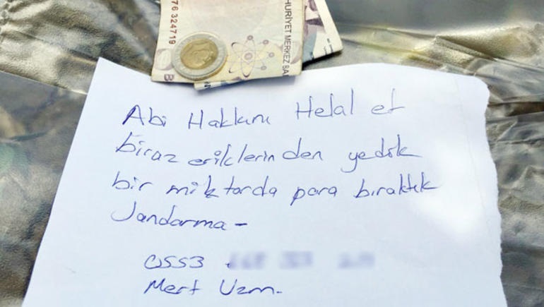 Yağcı, bahçede kiraz ve erik ağaçlarıyla uğraştığı sırada gözüne bir ağaçta sallanan poşetin çarptığını anlatarak, "Hemen gittim baktım ve içinde 10 lira 50 kuruş para ile bir not buldum. Notta 'Abi hakkını helal et. Biraz eriklerden yedik. Bir miktar para bıraktık. Jandarma' yazısını okuyunca duygulandım. Hemen altında yazılı telefon numarasını aradım. Arkadaşlara her zaman bahçeden erik ve kiraz yiyebileceklerini söyledim. Para da bırakmamalarını istedim. Çünkü askerler bu civarda devamlı devriye atarak hem bahçemizi hem malımızı hem de bizleri koruyor. Onların bize borcu olmaz. Her zaman gelip yesinler" dedi.