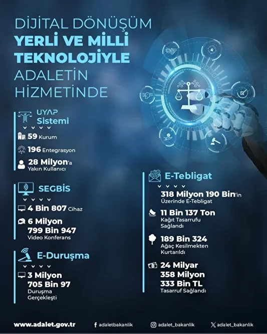 "Böylece yargı süreçlerini hızlandırırken doğamızın yok olmasının önüne geçtik. 2015 yılından günümüze 318 milyon 190 binin üzerinde e-Tebligat göndererek; 11 bin 137 ton kağıt tasarrufu sağladık, 189 bin 324 ağacı kesilmekten kurtardık, 24 milyar 358 milyon 333 bin TL tasarruf ettik. Hukukun üstünlüğünü esas alan, gecikmeyen ve öngörülebilir bir adalet sistemi vizyonuyla çalışmalarımızı kararlılıkla sürdüreceğiz. Kullanıcı memnuniyetini esas alan modern bir yazılım altyapısı ile bilişim sistemini yenilemeye devam edecek, yapay zekaya dayalı uygulamalar geliştireceğiz. Yeni teknolojilerin adalet hizmetlerinde kullanılmasını sağlayarak süreçlerin daha hızlı ve etkin bir biçimde sonuçlandırılmasını sağlayacağız."
