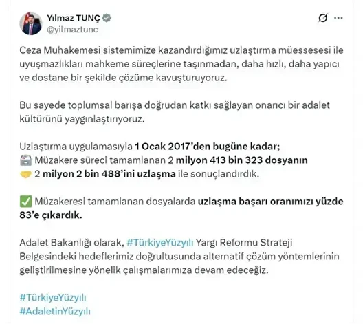 Bakan Tunç, sosyal medya hesabından yaptığı açıklamada, "Ceza Muhakemesi sistemimize kazandırdığımız uzlaştırma müessesesi ile uyuşmazlıkları mahkeme süreçlerine taşınmadan, daha hızlı, daha yapıcı ve dostane bir şekilde çözüme kavuşturuyoruz. Bu sayede toplumsal barışa doğrudan katkı sağlayan onarıcı bir adalet kültürünü yaygınlaştırıyoruz. Uzlaştırma uygulamasıyla 1 Ocak 2017'den bugüne kadar; müzakere süreci tamamlanan 2 milyon 413 bin 323 dosyanın 2 milyon 2 bin 488'ini uzlaşma ile sonuçlandırdık. Müzakeresi tamamlanan dosyalarda uzlaşma başarı oranımızı yüzde 83'e çıkardık. Adalet Bakanlığı olarak, Türkiye Yüzyılı Yargı Reformu Strateji Belgesindeki hedeflerimiz doğrultusunda alternatif çözüm yöntemlerinin geliştirilmesine yönelik çalışmalarımıza devam edeceğiz" ifadelerini kullandı.
