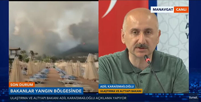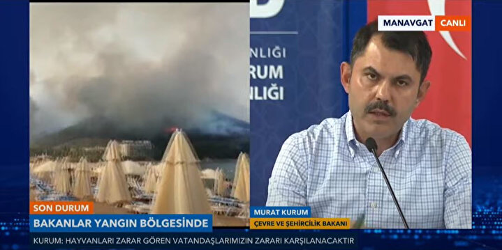 Çevre ve Şehircilik Bakanı Murat Kurum, Dışişleri Bakanı Mevlüt Çavuşoğlu ile Ulaştırma ve Altyapı Bakanı Adil Karaismailoğlu, Manavgat AFAD Koordinasyon Merkezi’nde açıklamalarda bulundu. Bakan Çavuşoğlu, yangın söndürme çalışmalarının titizlikle yürütüldüğünü vurgulayarak, "Birçok ülkeden destek teklifleri gelmeye devam ediyor. Azerbaycan'dan yarın sabah bir; bir şirketimizin, İsrail'deki bir şirketten kiraladığı iki uçak da yarın ülkemize gelecek." dedi. Bakan Kurum ise, "912 kişiye ödeme 13 milyon lira nakdi yardım yapıldı. Vatandaşlarımızın zarar gören ahırlarının yerine yenileri üç ay içinde yapılacak." ifadelerini kullandı.