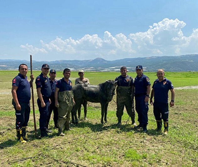 Manisa'nın Alaşehir ilçesinde, bataklığa saplanan 2 katır ile sahibi Mehmet Yöntem, jandarma ve itfaiye ekipleri tarafından kurtarıldı.