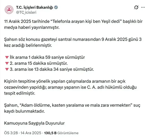 İçişleri Bakanlığı, "Telefonla arayan kişi, 'ben Yeşil' dedi" başlıklı habere ilişkin, aramanın açık cezaevinden "adam öldürme, kasten yaralama ve mala zarar vermekten" suç kaydı bulunan C.A. isimli bir hükümlü tarafından yapıldığını bildirdi.