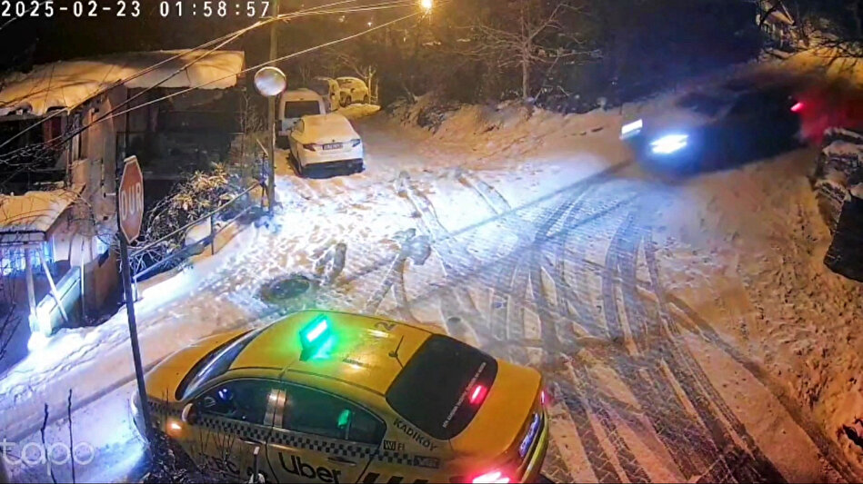 Görüntülerde buzlanan yolda kornaya basarak hızla ilerleyen otomobilin taksiye çarptığı anlar görüldü. Bu sırada taksinin direksiyon kabininde bulunan şoför, kendini aşağı atarken, çevredekiler yardıma koştu.