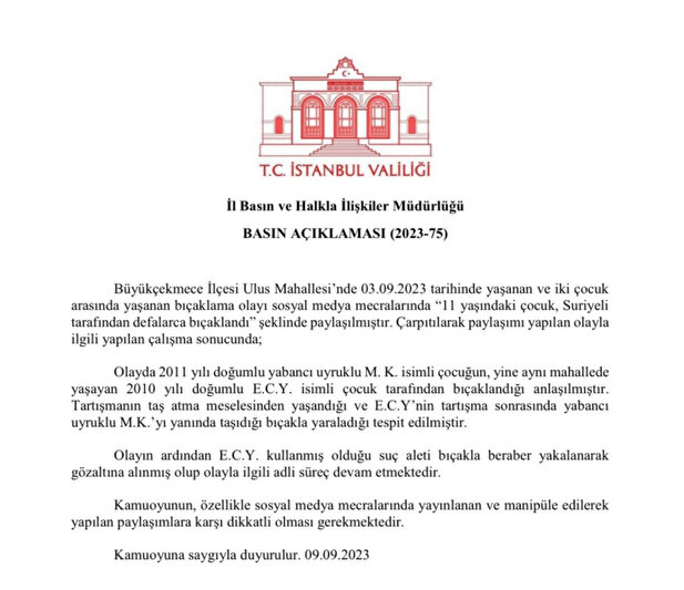 Cumhurbaşkanlığı İletişim Başkanlığı Dezenformasyonla Mücadele Merkezi, sosyal medyada dolaşıma sokulan "İstanbul Büyükçekmece’de 11 yaşındaki çocuk, bir Suriyeli tarafından defalarca bıçaklandı" haberlerine ilişkin açıklama yaptı. İddiaların yalan olduğu belirtilen açıklamada, "Büyükçekmece Ulus Mahallesinde meydana gelen olayda, E.C.Y. (13) isimli Türk vatandaşı bir çocuğun, M.K. (12) isimli yabancı uyruklu bir çocuğu bıçakla yaraladığı belirlenmiştir." denildi. İstanbul Valiliği de zanlının adli sürecinin devam ettiğini belirtip, "Özellikle sosyal medya mecralarında yayınlanan ve manipüle edilerek yapılan paylaşımlara karşı dikkatli olması gerekmektedir." uyarısını yaptı.