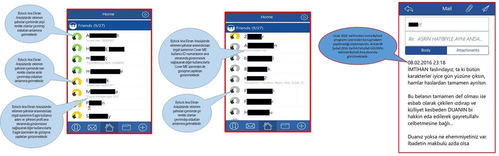 Gizli tanık "Yeğen"in itirafları ve İzmir Emniyet Müdürlüğü Terörle Mücadele Şubesince yapılan çalışmalarla, örgütün gizli yazışma programı ByLock'un ekran ara yüzü ortaya çıkarıldı.