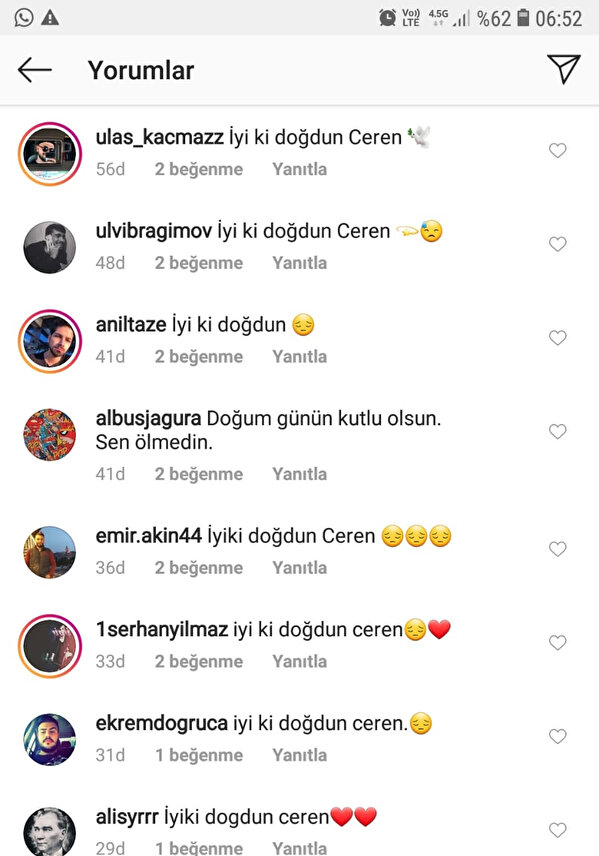 Sosyal medya hesaplarına binlerce takipçi, mesajlar atararak Ceren'in doğum gününü kutladı. Mesajlarda, 'Seni koruyamadık, bizi affet, doğum günün kutlu olsun', 'İyi ki doğdun melek yüzlü melek', 'İyiki doğdun prenses' gibi ifadelere yer verildi.
