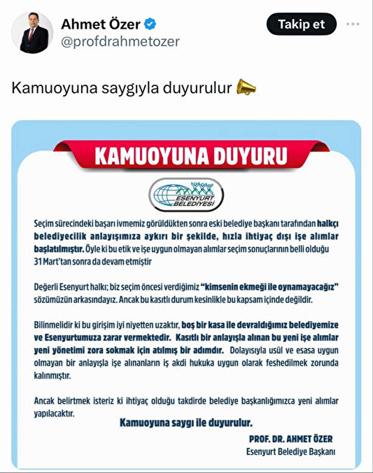 "Seçim sürecindeki başarı ivmemiz görüldükten sonra eski belediye başkanı tarafından halkçı belediyecilik anlayışımıza aykırı bir şekilde, hızla ihtiyaç dışı işe alımlar başlatılmıştır. Öyle ki bu etik ve işe uygun olmayan alımlar seçim sonuçlarının belli olduğu 31 Mart'tan sonra da devam etmiştir.