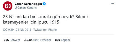 Cumhuriyet Halk Partisi (CHP) İstanbul İl Başkanı Canan Kaftancıoğlu, 23 Nisan 2013 yılında sosyal medya hesabından, 1915 yılında yaşanan tarihi gelişmelerle ilgili Ermeni tezlerini destekleyen bir mesaj paylaşmış, şu ifadeleri kullanmıştı: