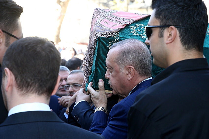 Cenaze töreninde kısa bir dua okuyan Cumhurbaşkanı Erdoğan, daha sonra tabutu bir süre omuzladı.