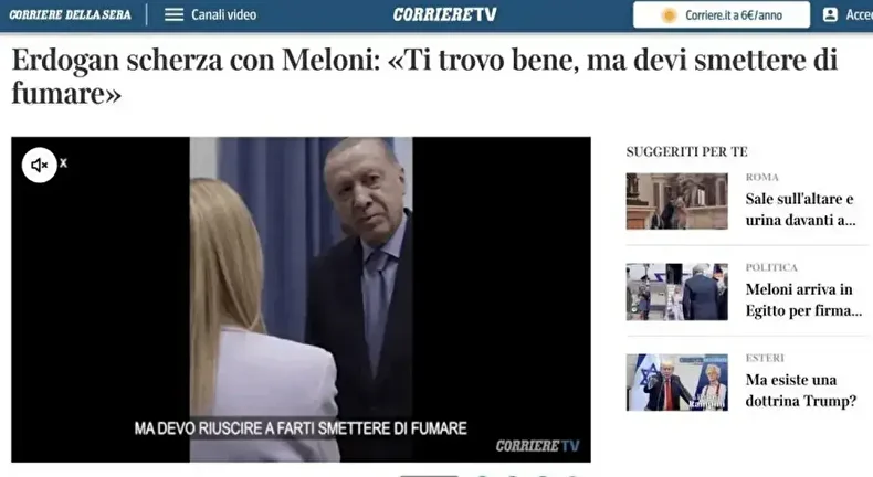 Corriere Della Sera gazetesinin internet sitesinde, "Erdoğan, Meloni'ye takıldı" başlığıyla verilen haberde Erdoğan ve Meloni'nin samimi bir an paylaştığı ve Erdoğan'ın İtalyan lidere gülümseyerek sigarayı bırakması gerektiğini söylediği kaydedildi.