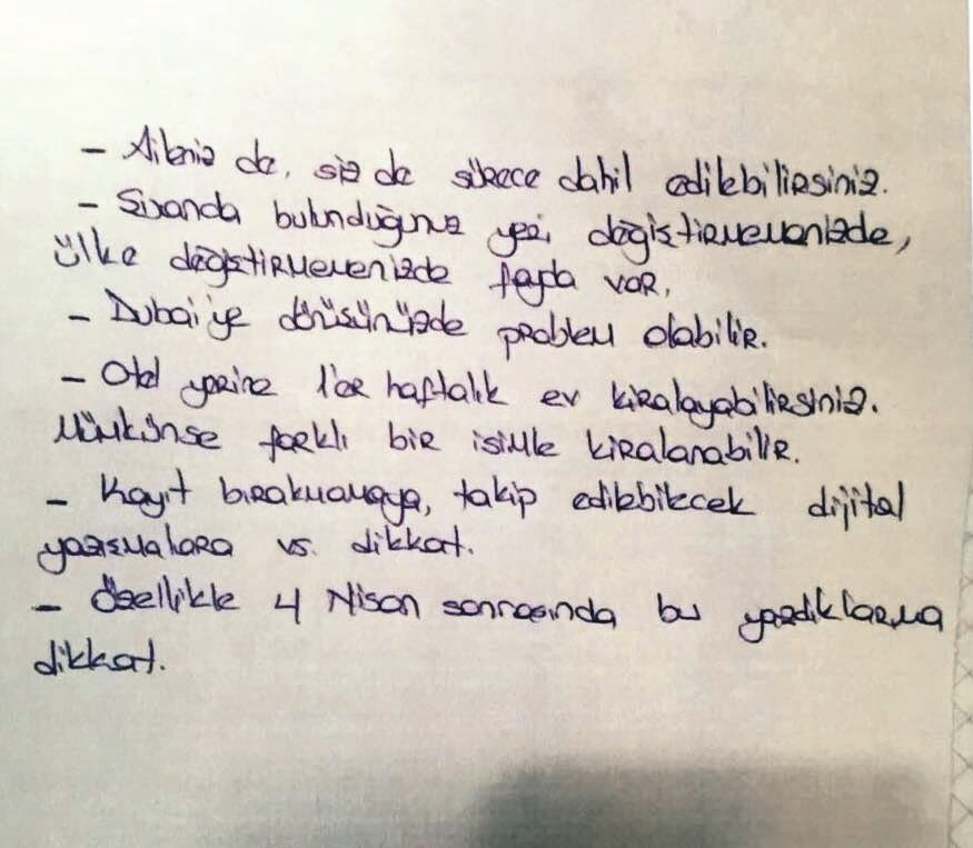 Zarrab’a Sinem A. tarafından giden el yazması cevap notunda ise “Aileniz de siz de sürece dahil edilebilirsiniz. Şu anda bulunduğunuz yeri değiştirmemenizde, ülke değiştirmemenizde fayda var. Dubai’ye dönüşünüzde problem olabilir. Otel yerine 1’er haftalık ev kiralayabilirsiniz. Mümkünse farklı bir isimle kiralanabilir. Kayıt bırakmamaya takip edilebilecek dijital yazışmalara vs. dikkat” ifadeleri yer alıyor. Bu yazının Zarrab’ın talimatıyla Sinem A. tarafından Dubai’deki avukata sorulduğu ve cevabın da Zarrab’a aktarıldığı değerlendirmesinde bulunuluyor.