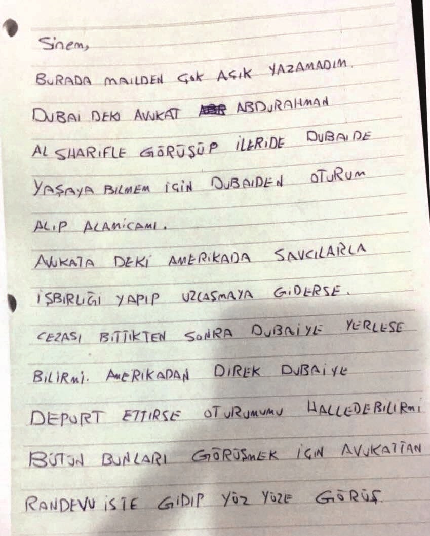 Notta, “Sinem burada mailden çok açık yazamadım. Dubai’deki avukat Abdurrahman Al Sharif’le görüşüp ileride Dubai’de yaşayabilmem için Dubai’den oturum izni alıp alamayacağımı.. Avukata de ki ABD’de savcılarla işbirliği yapıp uzlaşmaya giderse cezası bittikten sonra Dubai’ye yerleşebilir mi? ABD’den direkt Dubai’ye deport ettirse oturumumu halledebilir mi? Bütün bunları görüşmek için avukattan randevu iste. Gidip yüz yüze görüş” ifadeleri yer alıyor.