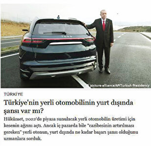 - CHP ve İP’in karşı çıktığı yerli otomobil, dünya otomotiv sektörünün liderlerinden Almanya’da kafaları karıştırdı. Almanya’nın resmi yayın organı Deutsche Welle (DW) yerli otomobilin tanıtımının yapıldığı gün “Türkiye’nin yerli otomobilinin yurtdışında şansı var mı?” başlıklı bir haber yayınladı. Yerli oto için yıllık 175 bin adetlik üretimin dünya pazarları açısından çok küçük bir miktar olduğu ve kısa vadede dikkat çekecek bir marka olamayacağının belirtildiği haberde Türkiye’nin uluslararası otomotiv devlerinin üretim üssü olduğu da vurgulandı. Haberde görüşlerine yer verilen Taşıt Araçları Tedarik Sanayicileri Derneği (TAYSAD) Başkanı Alper Kanca, “Böylesi zorlu bir konjonktürde Türkiye’nin kendi ürettiği elektrikli aracıyla dünya pastasından pay alması kısa vadede mümkün görünmüyor” dedi.
