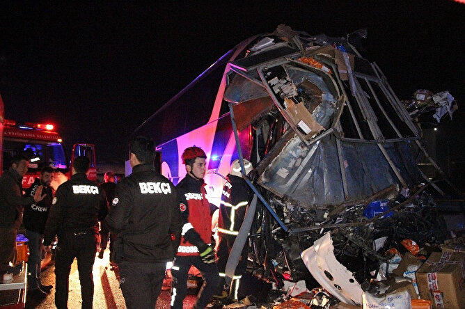 Düzce’de, TEM Otoyolu’nda yasak olmasına rağmen refüjde bulunan boşluktan diğer istikamete geçmeye çalışan TIR’a arkadan gelen yolcu otobüsü çarptı. Kazada otobüs şoförü ile muavin yaşamlarını yitirirken, 35 kişi yaralandı.