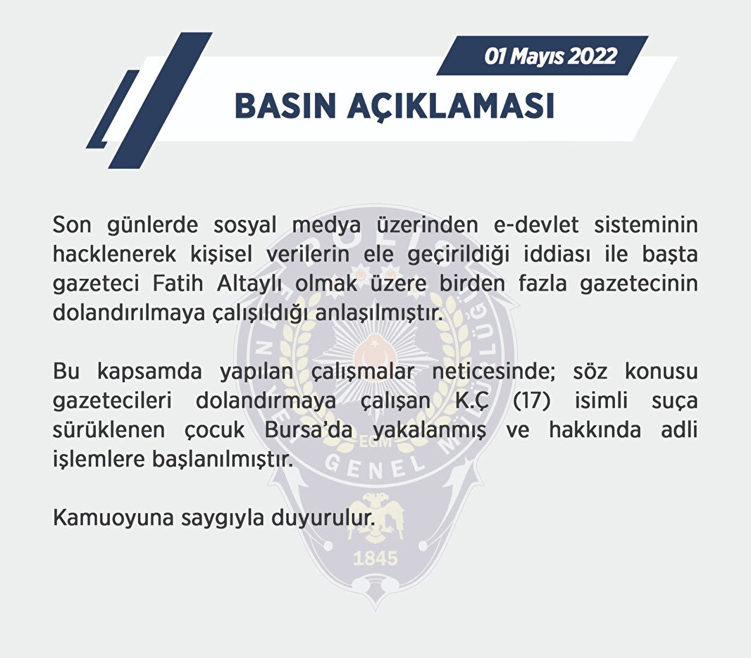 EGM'nin sosyal medya hesabından yapılan açıklamada, son günlerde sosyal medya üzerinden e-Devlet sisteminin "hacklenerek" kişisel verilerin ele geçirildiği iddiasıyla Fatih Altaylı'nın da aralarında bulunduğu birden fazla gazetecinin dolandırılmaya çalışıldığının anlaşıldığını belirtti.