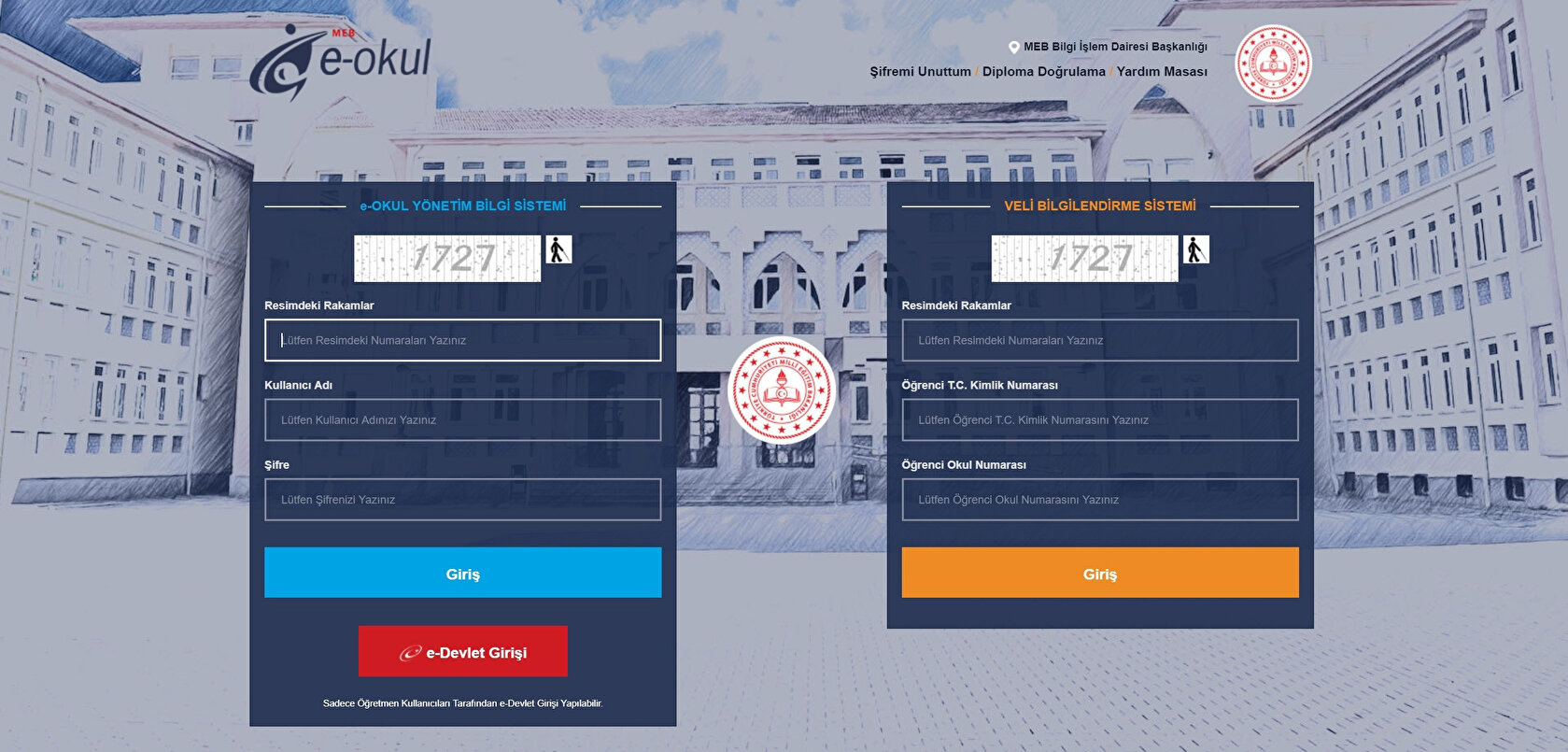 Sisteme giriş yapabilmek için öğrencinin T.C. kimlik numarası ile okul numarası giriş yapıldıktan sonra 4 haneli güvenlik kodu da kutuya girilmelidir.