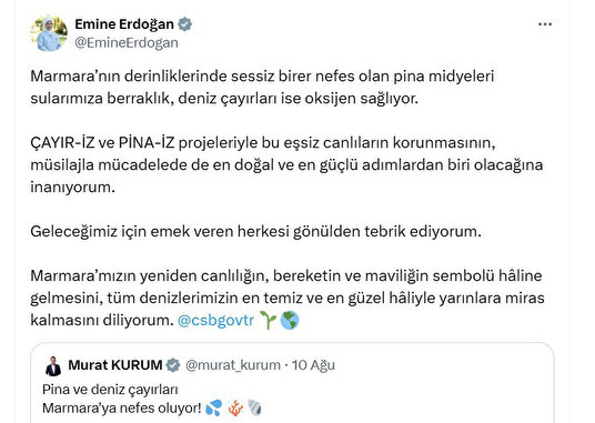 Cumhurbaşkanı Recep Tayyip Erdoğan’ın eşi Emine Erdoğan, sosyal medya hesabından, Çevre, Şehircilik ve İklim Değişikliği Bakanı Murat Kurum’un "Pina ve deniz çayırları Marmara’ya nefes oluyor" paylaşımını alıntılayarak, şunları kaydetti:
