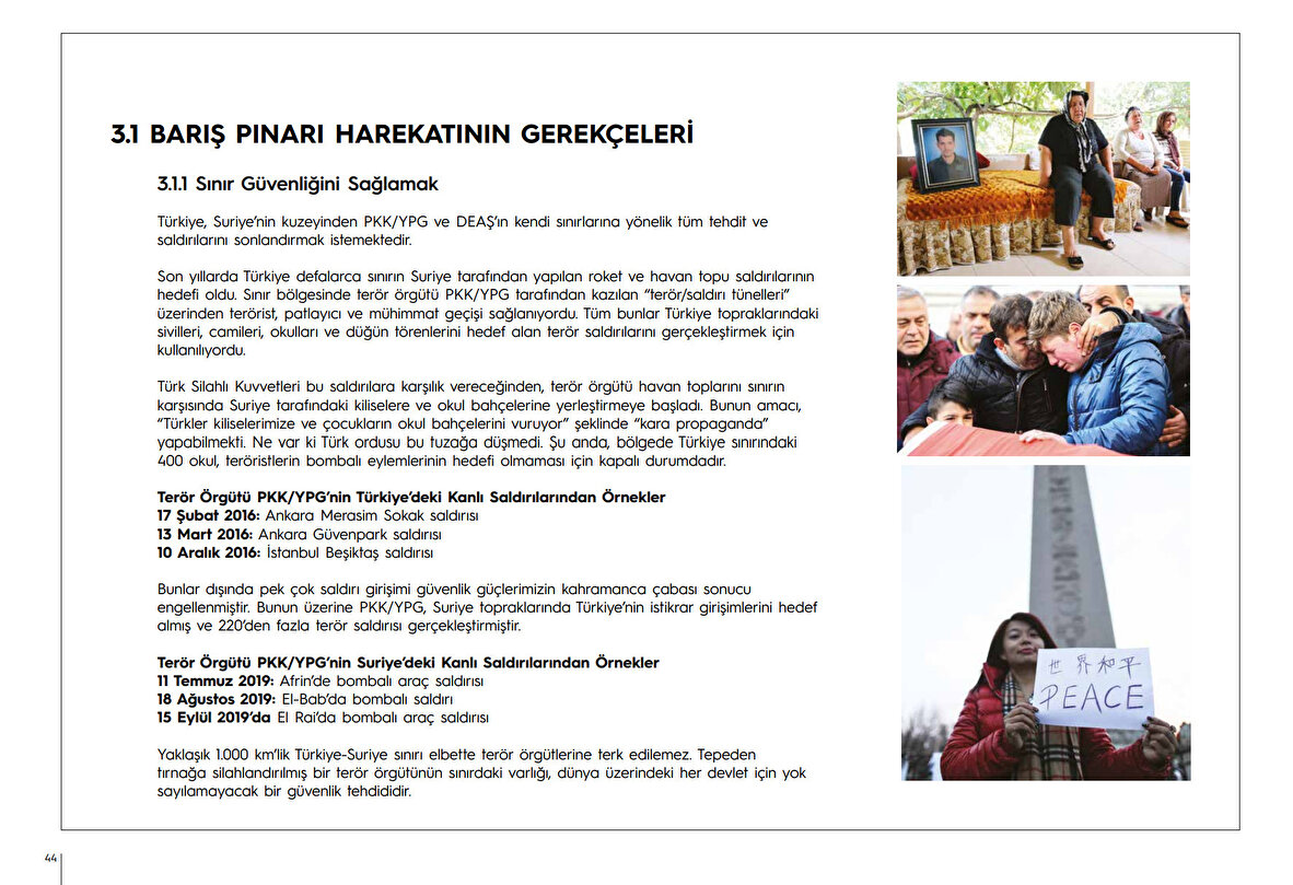 Barış Pınarı Harekatı'nın neden başladığı ve Suriye'nin kuzeydoğusunda kurulacak güvenli bölge ile neler planlandığı ise kitapçıkta ayrıntılı bir şekilde ele alınıyor.