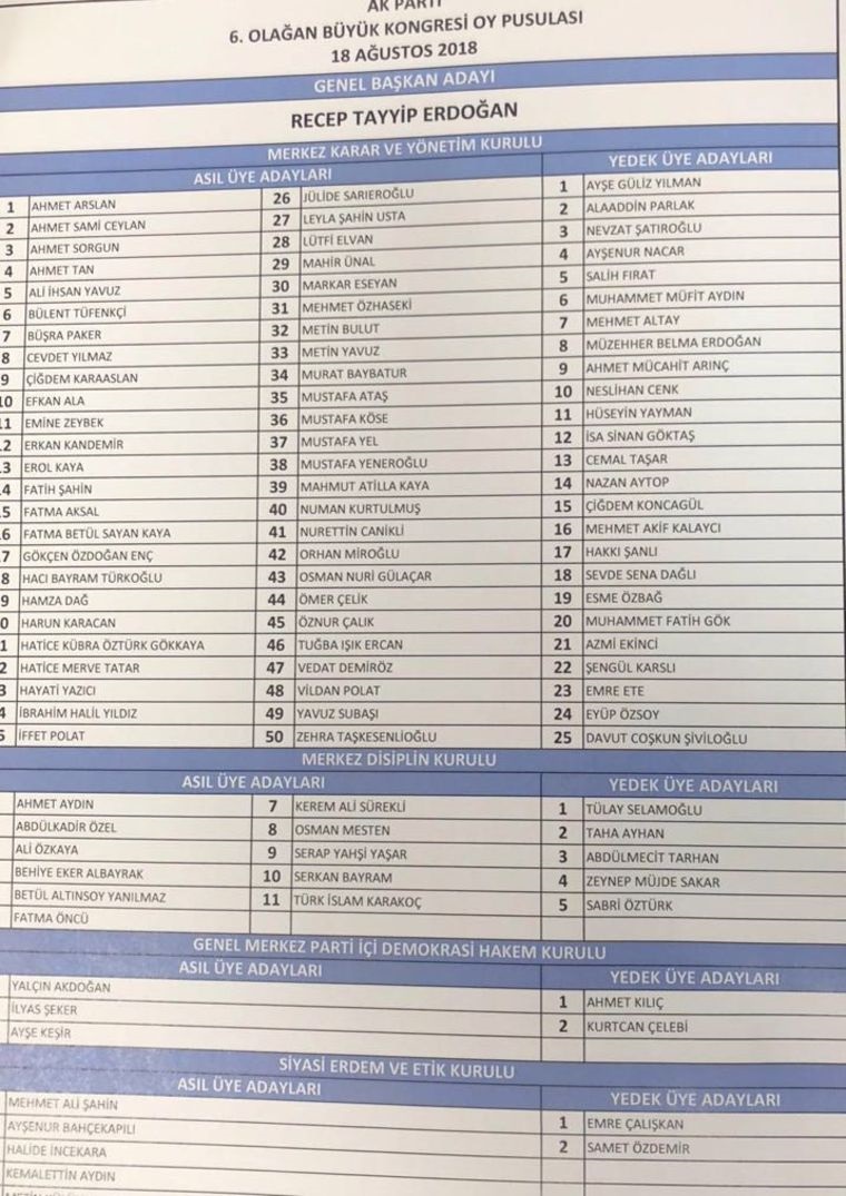 AK Parti'nin bugün gerçekleşen 6. Olağan Kongresi'nin ardından partinin hem Merkez Karar ve Yönetim Kurulu (MKYK) hem de Merkez Yürütme Kurulu’nda (MYK) görev alacak isimler belli oldu. AK Parti'nin Merkez Karar Yürütme Kurulu'nda 27. dönemden 42 vekil, 8 milletvekili olmayan üye ve 29 yeni üyeden oluştu.