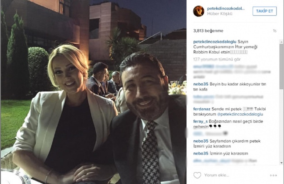 Eşi Serkan Kodaloğlu ile Huber köşkündeki iftarda çekildiği bir fotoğrafı sosyal medyada paylaşan Petek Dinçöz ise "İzmir'in yüz karasısın" gibi yorumlarla linç edildi.
