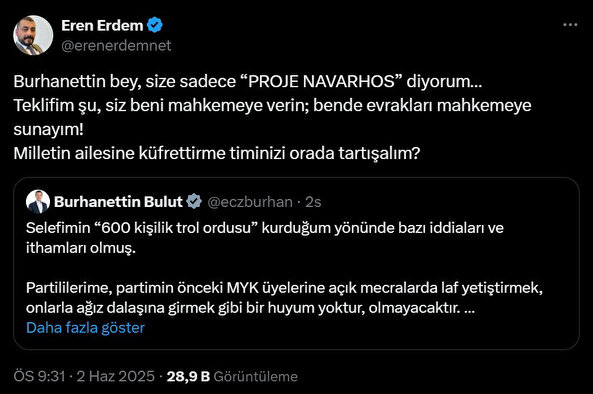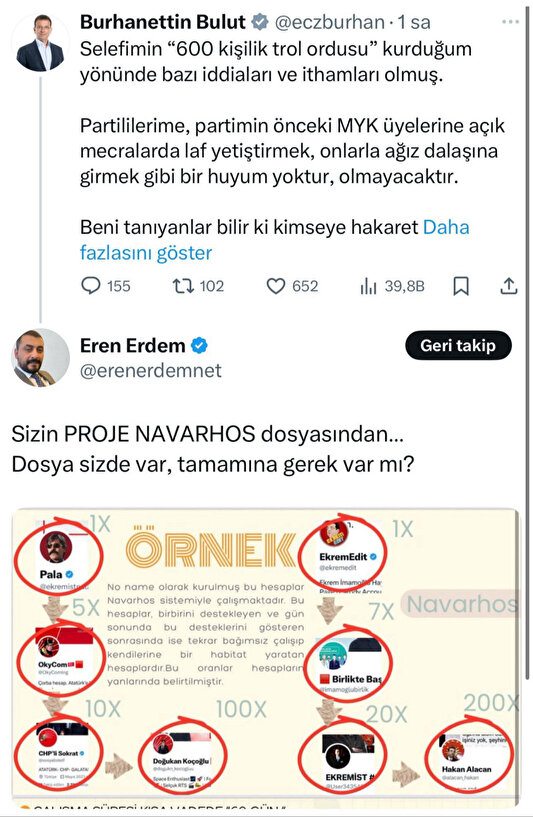 CHP Halkla İlişkiler ve Medyayla İlişkilerden Sorumlu Genel Başkan Yardımcısı Burhanettin Bulut'un 46 milyon TL'ye 600 kişilik trol timi kurduğunu öne süren CHP'li Eren Erdem, bu yapılanmaya ilişkin ifşaatlarını sürdürüyor. İddialarını yalanlayan Bulut'a yanıt veren Erdem, "Burhanettin Bey, size sadece 'PROJE NAVARHOS' diyorum…Teklifim şu, siz beni mahkemeye verin; ben de evrakları mahkemeye sunayım" diyerek bir de görsel paylaştı.