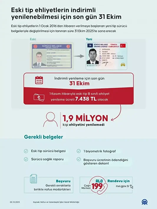 Eski tip sürücü belgesi kullanan kişilerin, 31 Ekim'e kadar yenileme işlemi yapmaması durumunda ehliyetleri geçersiz olacak.