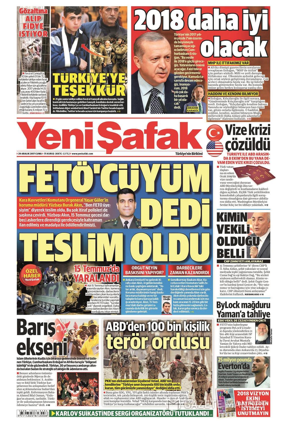 - Yeni Şafak, 2017 yılını gündem sarsan haberiyle kapatmıştı. Hüseyin Likoğlu imzalı “FETÖ’cüyüm dedi teslim oldu” manşetinde, Kara Kuvvetleri Komutanı Orgeneral Yaşar Güler’in koruma müdürü Yüzbaşı Burak Akın’ın, FETÖ üyesi olduğunu itiraf ederek teslim olduğu anlatıldı. Şok itiraf ülke gündemine bomba gibi düştü. Yüzbaşı Akın, 15 Temmuz gecesi darbeci askerlere direndiği gerekçesiyle kahraman ilan edilmiş, madalya ile ödüllendirilmişti.