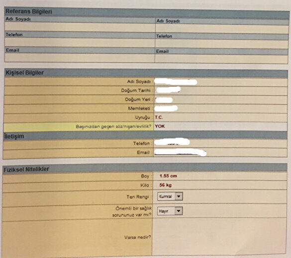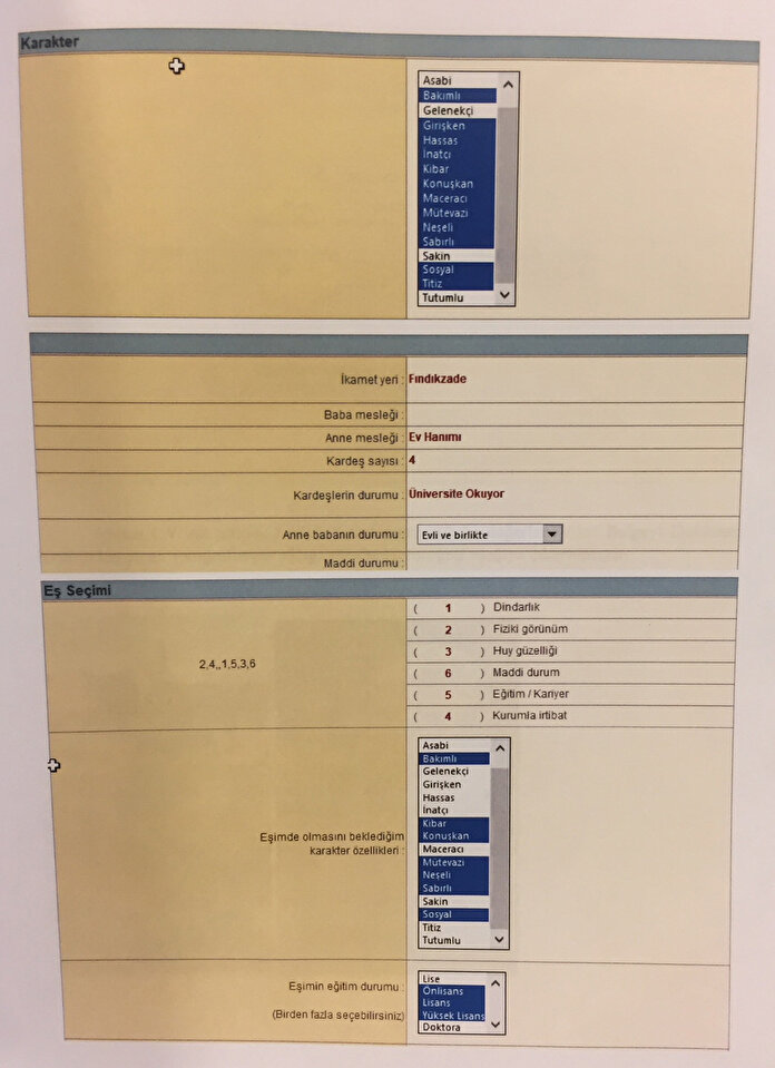 Dijital katalogta filtreleme haricinde, ''Eşiniz ile ilgili formda yer almayıp belirtmek istedikleriniz nelerdir?'' başlıklı yazı alanı da yer alıyor. Dijital belgeyi dolduran örgüt mensubunun vesikalık ve boydan fotoğrafları da bulunuyor.